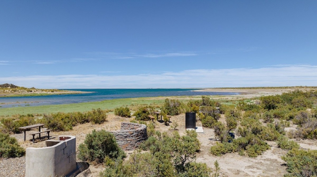 Camping Bahía Arredondo: A 800 metros de la costa y a 90 km al sur de Camarones, ofrece nueve sitios de acampe, baños secos, un fogón comunitario y el refugio “Puesto Julie”, equipado con cocina. Está próximo al Glamping Isla Leones.