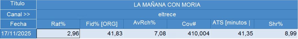 Con respecto a «La Mañana con Moria», logró un rating promedio de 2,96 puntos -la medición más alta desde su debut el lunes 10- quedando en segundo lugar de la franja horaria, detrás de «A la Barbarossa», el ciclo que conduce Georgina Barbarossa por Telefe, que logró 3,7.