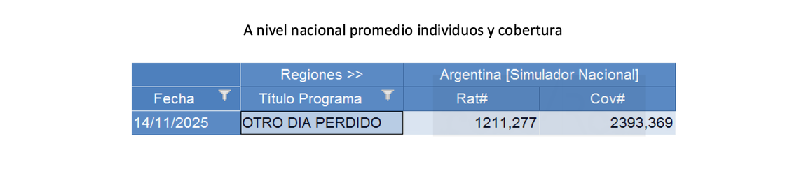 En cuanto a la cobertura nacional de los individuos que vieron las entrevistas, Mario Pergolini también superó a Moria Casán. En rating individuos únicos que vieron el programa fue de 1.211.277 contra 469.349 y en cobertura fue se 2.393.369 contra 984.365, siempre a favor de «Otro Día Perdido».