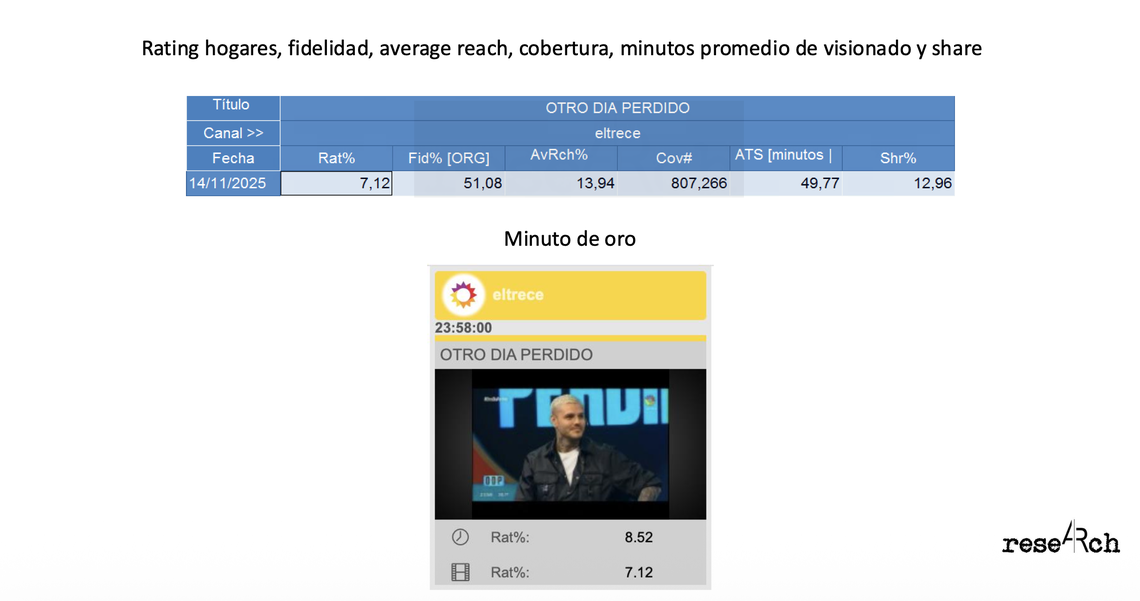 El programa de Mario Daniel Pergolini logró un promedio de 7,12 puntos de rating, con un share de 12,96 % y un Minuto de Oro de 8,52, a las 23:58 del viernes 14 de noviembre. «Otro Día Perdido» no sólo fue lo más visto de El Trece, sino que superó a toda su competencia, incluso a Telefe que emitió un extracto del partido de la Selección Argentina Sub 17.