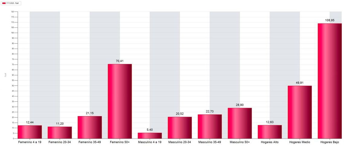 En cuanto a la composición de los espectadores que vieron la entrevista de Moria Casán a María Eugenia Suárez fue mayoritariamente femenina, y la mujeres de 50 y más se quedaron con el 70,41 %.