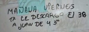 En paralelo, en la E.E.S N°36 de Fontana, se descubrió un nuevo mensaje: “Mañana viernes 17 le descargo el 38 a Juan de 4° 3ra”. Los directivos se alarmaron y llamaron a la policía. Debido a la amenaza, este viernes el joven no fue a la escuela por recomendaciones de los agentes de la Comisaría Primera de Fontana, mientras investigan para saber quién fue el autor. También se reforzaron las medidas de seguridad en los horarios de ingreso y egreso del establecimiento.