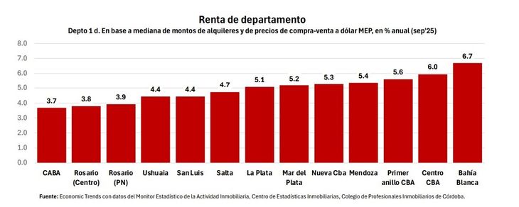 Los datos del CEI muestran que Córdoba se ubica entre las ciudades con mejor relación entre precio y renta del país. En septiembre, el rendimiento promedio en la capital cordobesa superó al de CABA, Rosario, Ushuaia y Salta, y se ubicó en niveles similares a los de Mendoza y La Plata, con tasas de entre 5% y 6,5% anual.