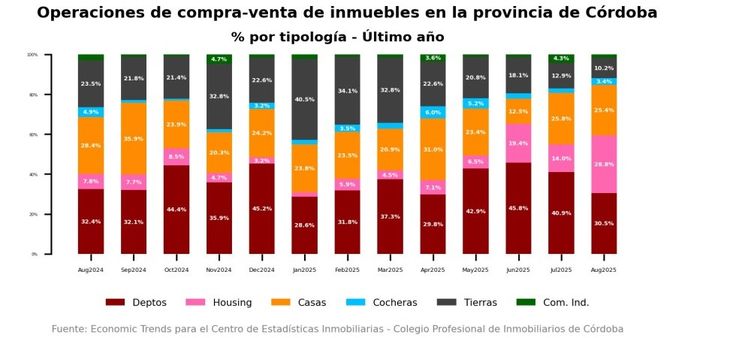 La composición de las operaciones de compraventa de inmuebles en la provincia de Córdoba durante agosto de 2025 fue la siguiente: