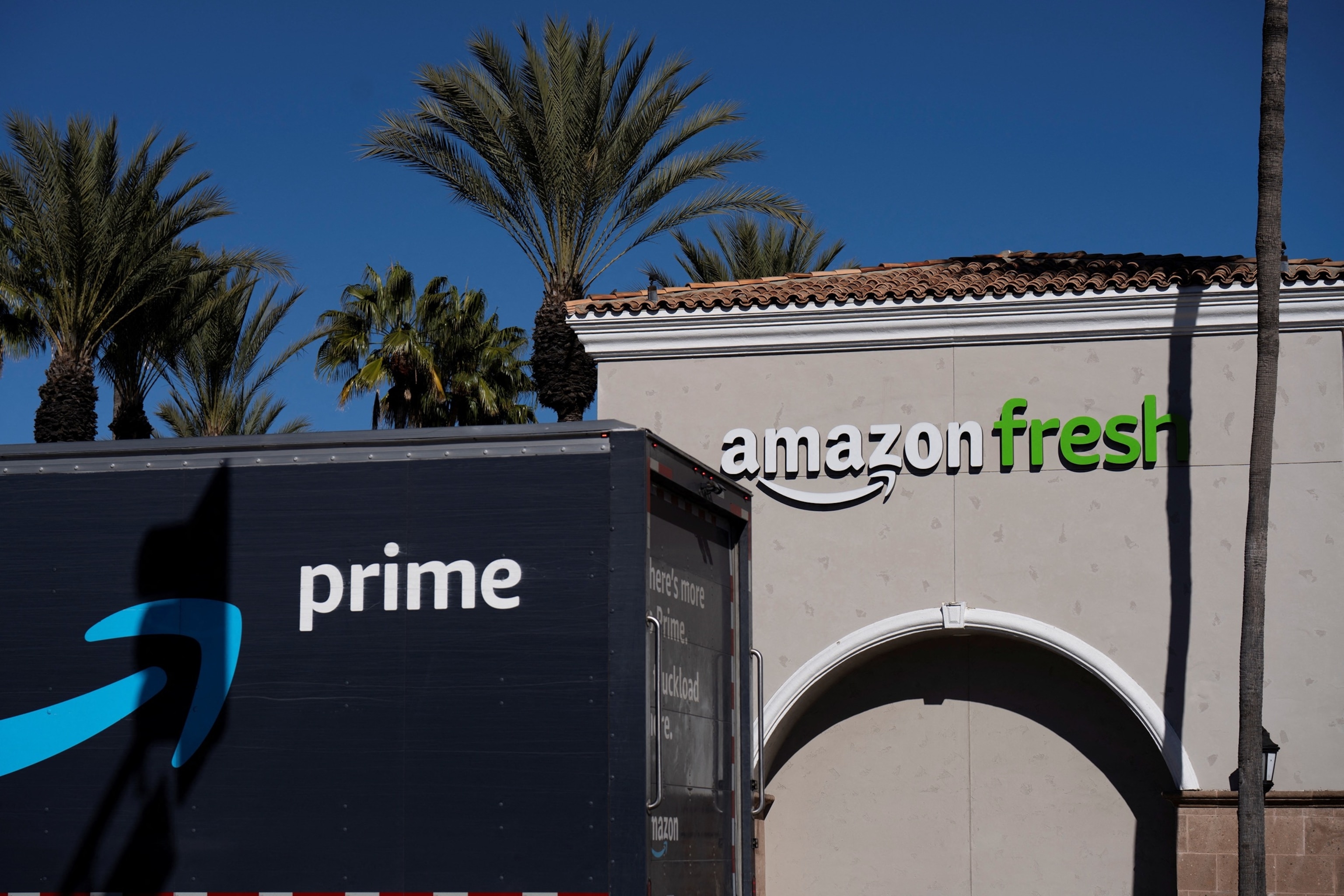 An Amazon Prime delivery truck drives by an Amazon Fresh grocery store on the day Amazon said it would shutter its Amazon Go and Amazon Fresh physical stores in Encino, California, U.S., January 27, 2026.