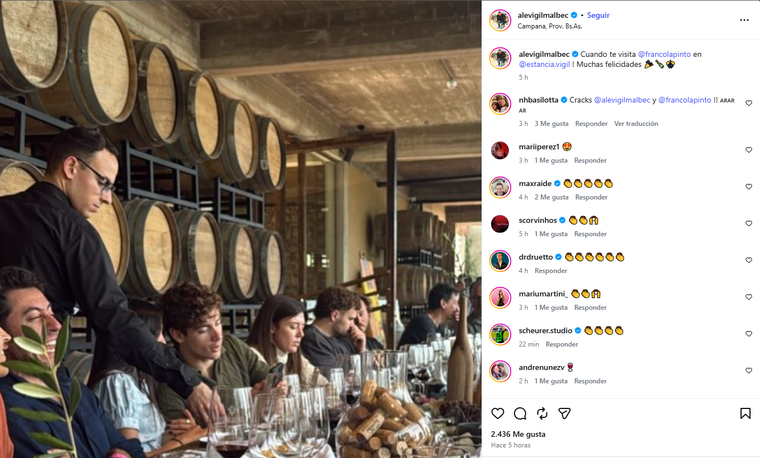 La presencia de Colapinto en la estancia fue compartida por el propio Alejandro Vigil. «Cuando te visita Franco Colapinto en Estancia Vigil. ¡Muchas felicidades!», escribió el enólogo en sus redes sociales. En el posteo se puede ver al piloto disfrutando de las bondades del lugar.