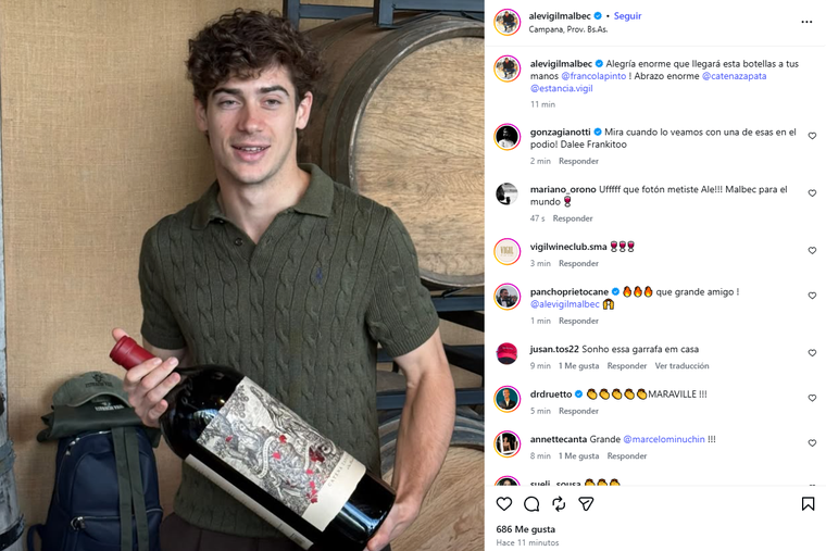Minutos después, Vigil también publicó una imagen en la que se lo ve a Colapinto con una botella de vino. «Alegría enorme que llegara esta botella a tus manos. Abrazo enorme», expresó el enólogo en sus redes.