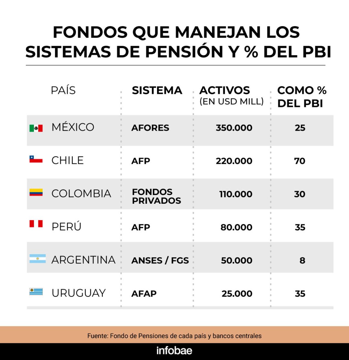 Las AFP hoy gestionan USD 220.000 millones en ahorro de largo plazo, cerca del 70% del PBI chileno, lo que permite financiar al sector privado con tasas bajas. México ocupa el último lugar entre sus pares, pero aun así triplica el nivel de financiamiento privado argentino.