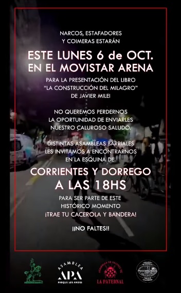 Asambleas de diversos barrios de la Ciudad de Buenos Aires anunciaron que este lunes a las 18 realizarán una protesta en Corrientes y Dorrego (Comuna 15) contra el presidente Javier Milei, que presentará en el Movistar Arena su nuevo libro “La construcción del milagro” a la vez que dará un recital con su grupo “La banda presidencial”.