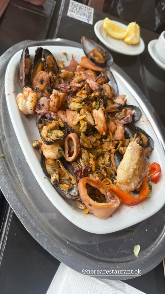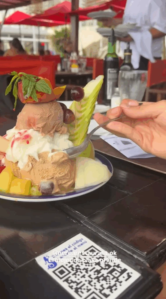 En una de las imágenes se puede ver un plato abundante de mariscos en el reconocido restaurant, ubicado en Playa Grande. Mejillones, calamares, langostinos y otros frutos de mar se lucen en la bandeja, acompañados por rodajas de limón, en lo que parece ser un almuerzo frente al mar. Más tarde, la pareja mostró el postre: una copa helada decorada con frutas frescas como melón, uvas y frutillas, coronada con hojas de menta, que confirma que la experiencia gastronómica fue parte clave del viaje.