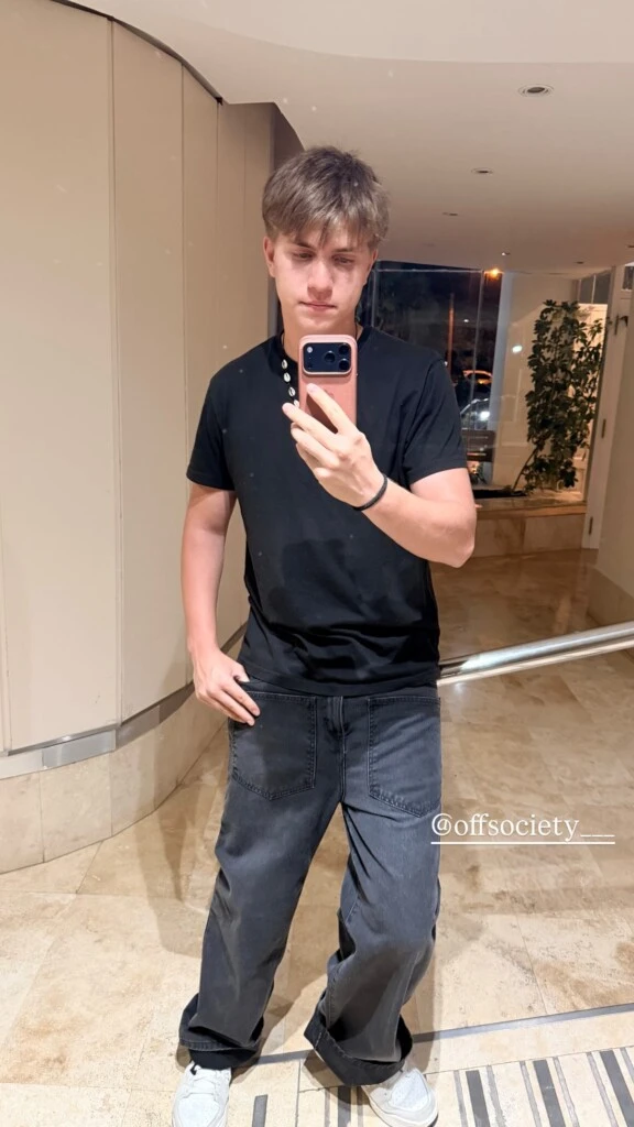 Valentino también subió contenido desde el hotel, mostrando un look casual en tonos oscuros, con jeans amplios y remera negra, en una selfie tomada frente a un espejo. El detalle del etiquetado a una marca de indumentaria confirma que el estilo sigue siendo parte de su identidad, incluso en un viaje relajado.