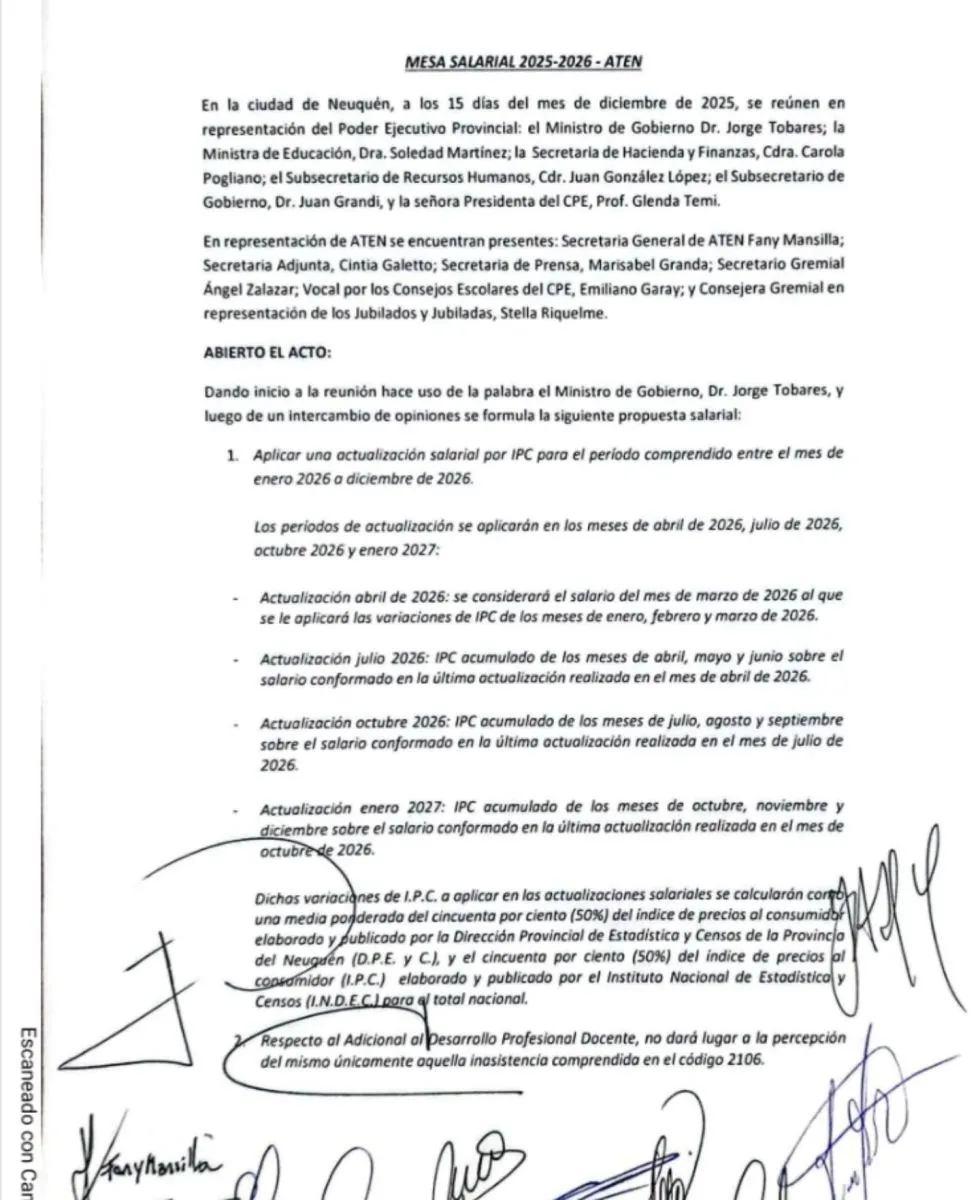 El Gobierno de Neuquén presentó a los gremios docentes una propuesta salarial que contempla incrementos trimestrales entre enero y diciembre de 2026, actualizados por IPC nacional y provincial, junto al pago de dos sumas extraordinarias de 350.000 pesos y la garantía del FONID y Conectividad Nacional con recursos propios. “En ATEN deciden las asambleas”, remarcaron desde el sindicato.