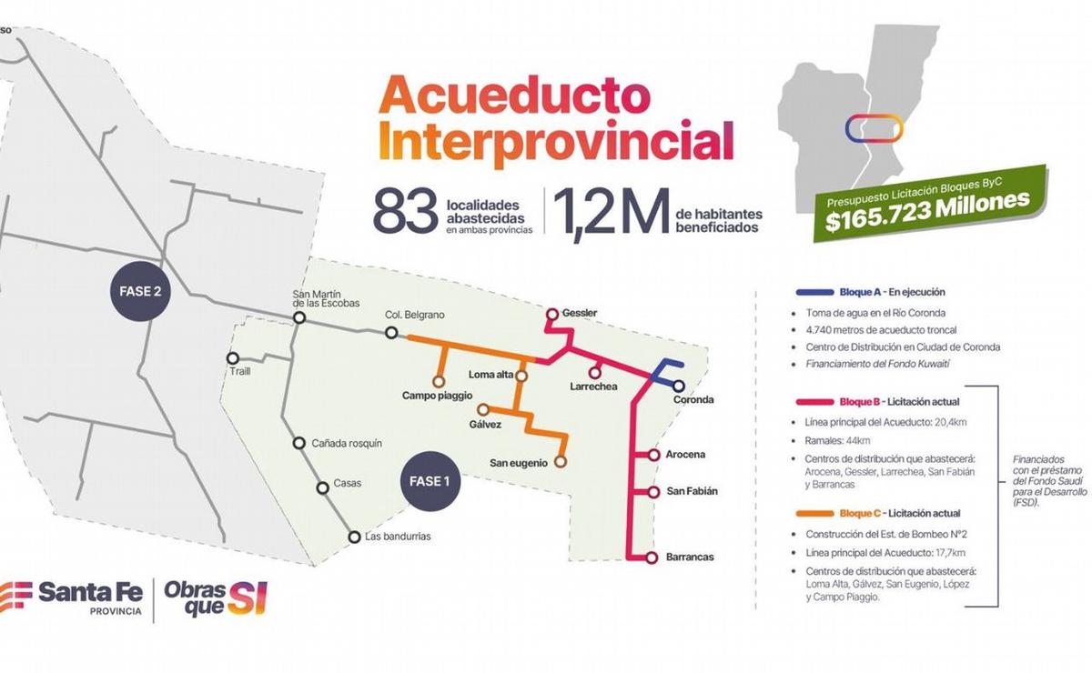La etapa A, hoy en ejecución, contempla la obra de toma, el acueducto de agua cruda, la planta potabilizadora, parte de la red troncal y los primeros ramales que abastecen a Coronda. Esta fase cuenta con apoyo financiero del Fondo Kuwaití por 50 millones de dólares.
