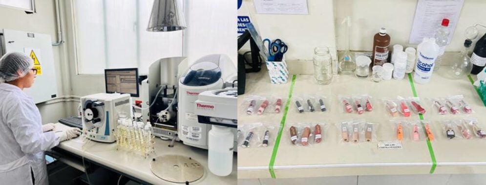 Evelyn Santos (izq.) analizó mediante espectrofotometría de absorción atómica, 30 lápices labiales (der.) recolectados en las galerías informales del centro de Lima. En todos ellas encontró presencia de metales pesados.Crédito de la imagen: cortesía de Evelyn Santos para SciDev.Net.