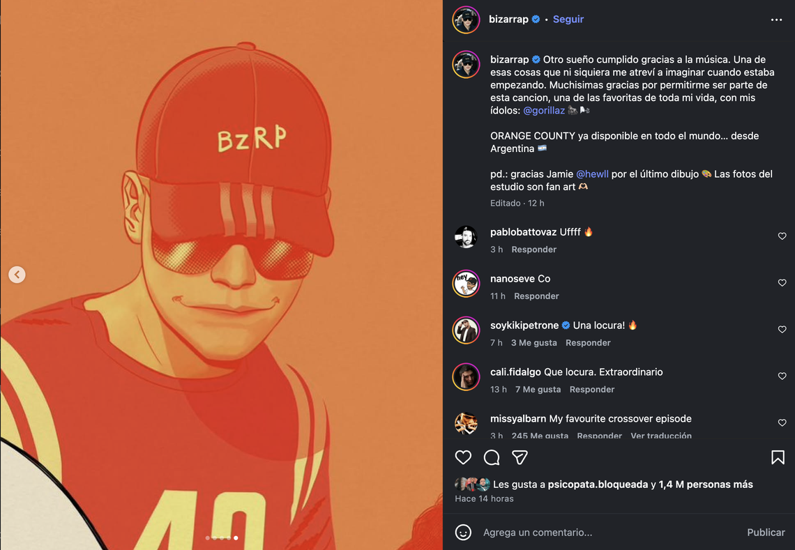 “Otro sueño cumplido gracias a la música. Una de esas cosas que ni siquiera me atreví a imaginar cuando estaba empezando. Muchísimas gracias por permitirme ser parte de esta canción, una de las favoritas de toda mi vida, con mis ídolos: @gorillaz” expresó el artista argentino en sus cuenta de Instagram y de X (exTwitter),