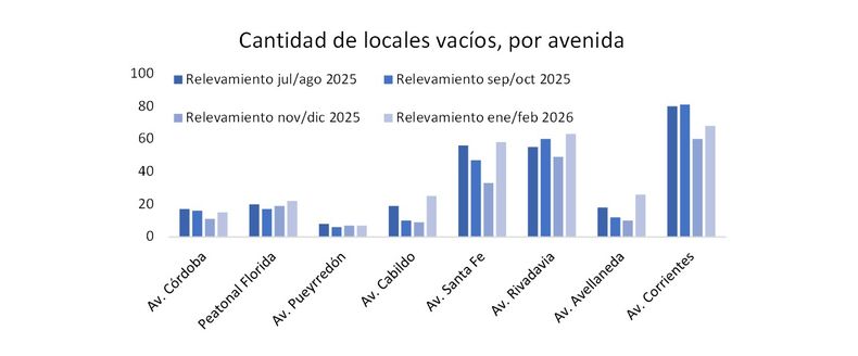 Al momento de analizar las arterias más importantes de la Ciudad, el trabajo de la CAC detalla que la avenida con mayor cantidad de locales vacíos, en su variación bimestral, fue la Avenida Corrientes, con 68 establecimientos sin actividad.