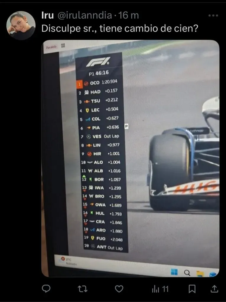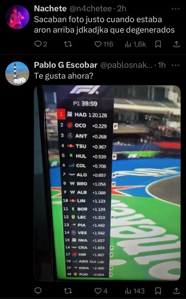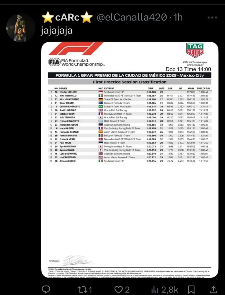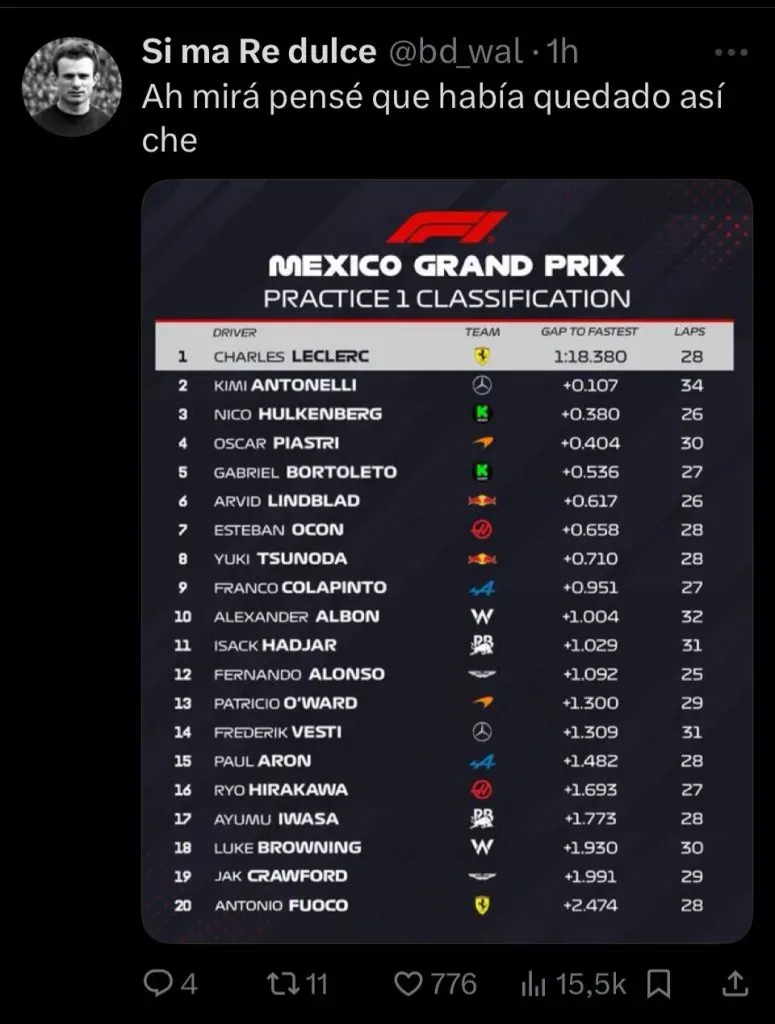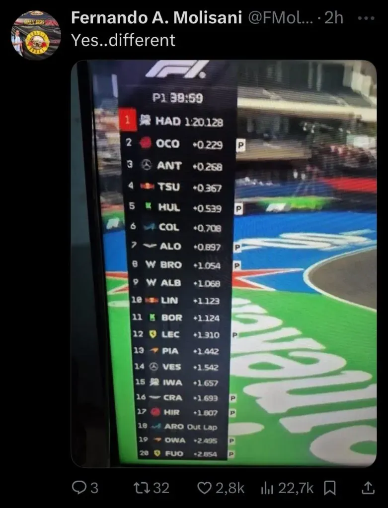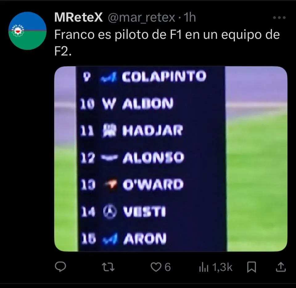 El epicentro del conflicto fue un posteo realizado por Alpine en sus redes sociales mientras transcurría la sesión y los autos estaban en boxes. La publicación mostraba una foto de la torre de tiempos (el clasificador en vivo) acompañada del texto: “La torre de tiempo se ve un poco diferente hoy“, en clara alusión a la cantidad de rookies en pista. El tema fue el detalle que encendió la mecha: la imagen seleccionada por el equipo mostraba a Paul Aron en el puesto 11, por delante de Colapinto, ubicado en el P12.