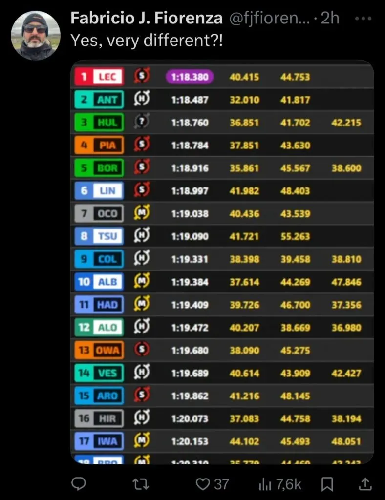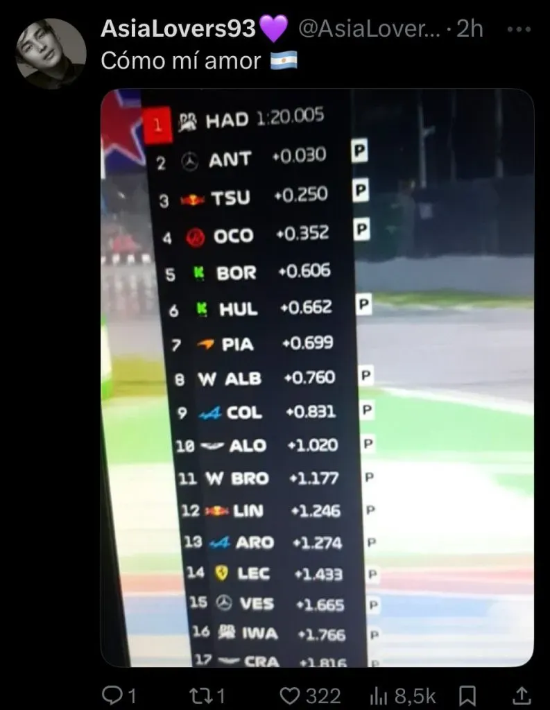 En ese sentido, los usuarios inundaron la publicación con capturas de pantalla del clasificador final, donde el argentino aparecía noveno. Jugando irónicamente con el propio texto de Alpine, muchos fanáticos respondieron que, efectivamente, la torre se veía “diferente”, pero adjuntando la imagen que reflejaba la superioridad del piloto de Pilar.