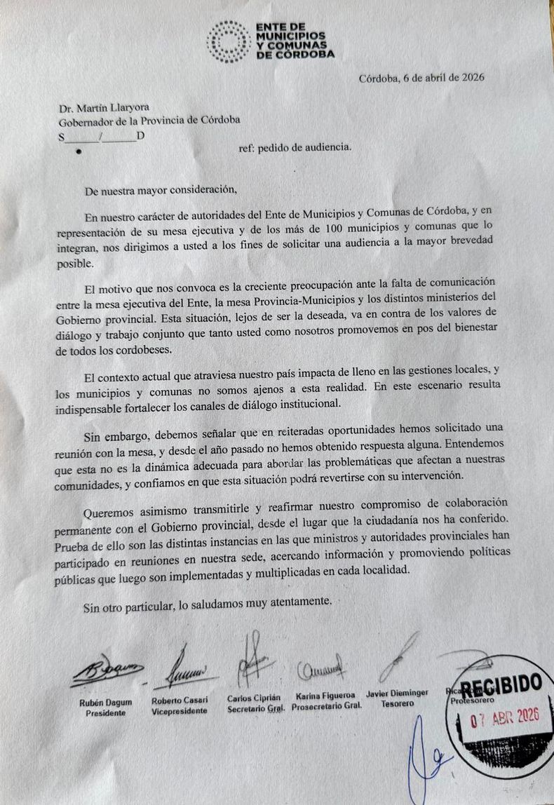 Apremiados por una caída de 23% en las coparticipaciones que reciben del gobierno provincial, las autoridades municipales que representan a la UCR en más de 100 municipios de Córdoba pidieron formalmente al gobernador Martín Llaryora una audiencia “a la mayor brevedad posible”.