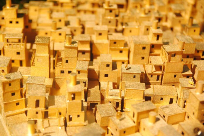 El mundo de la arquitecta Ana Rascovsky se conoce como “Acrilia”. En él, la Ciudad Dorada crece desmesuradamente, por donde puede, trepando, superponiendo sus construcciones, pero solo durante la noche, cuando nadie ve. Utilizando cartón y luces led, Rascovsky representa la competencia entre las fuerzas de la humanidad, la naturaleza y la tecnología.