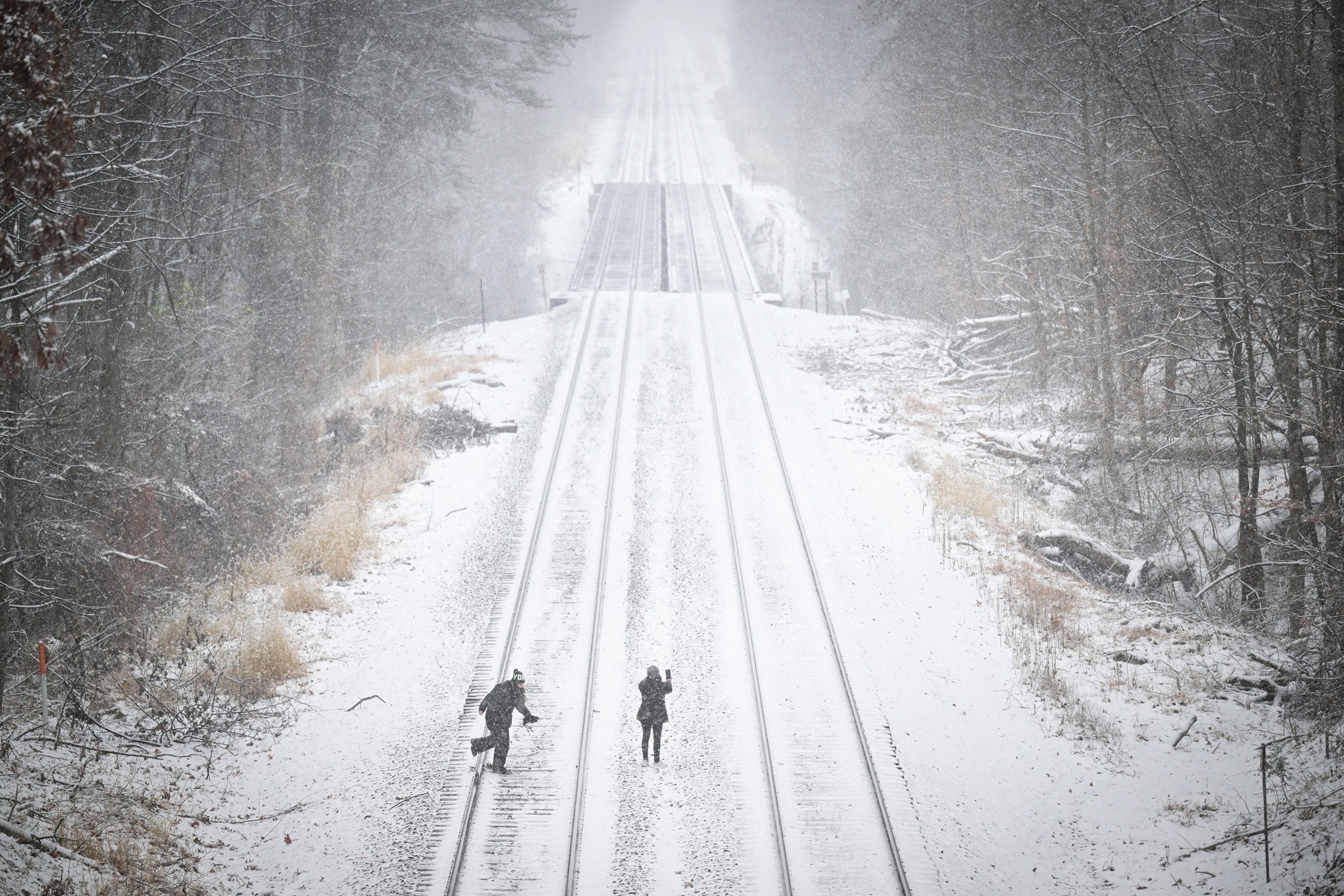 La gente explora la primera nieve de la temporada a lo largo de las vías del ferrocarril no lejos del lago Accotink, el 5 de diciembre de 2025 en Springfield, VA.