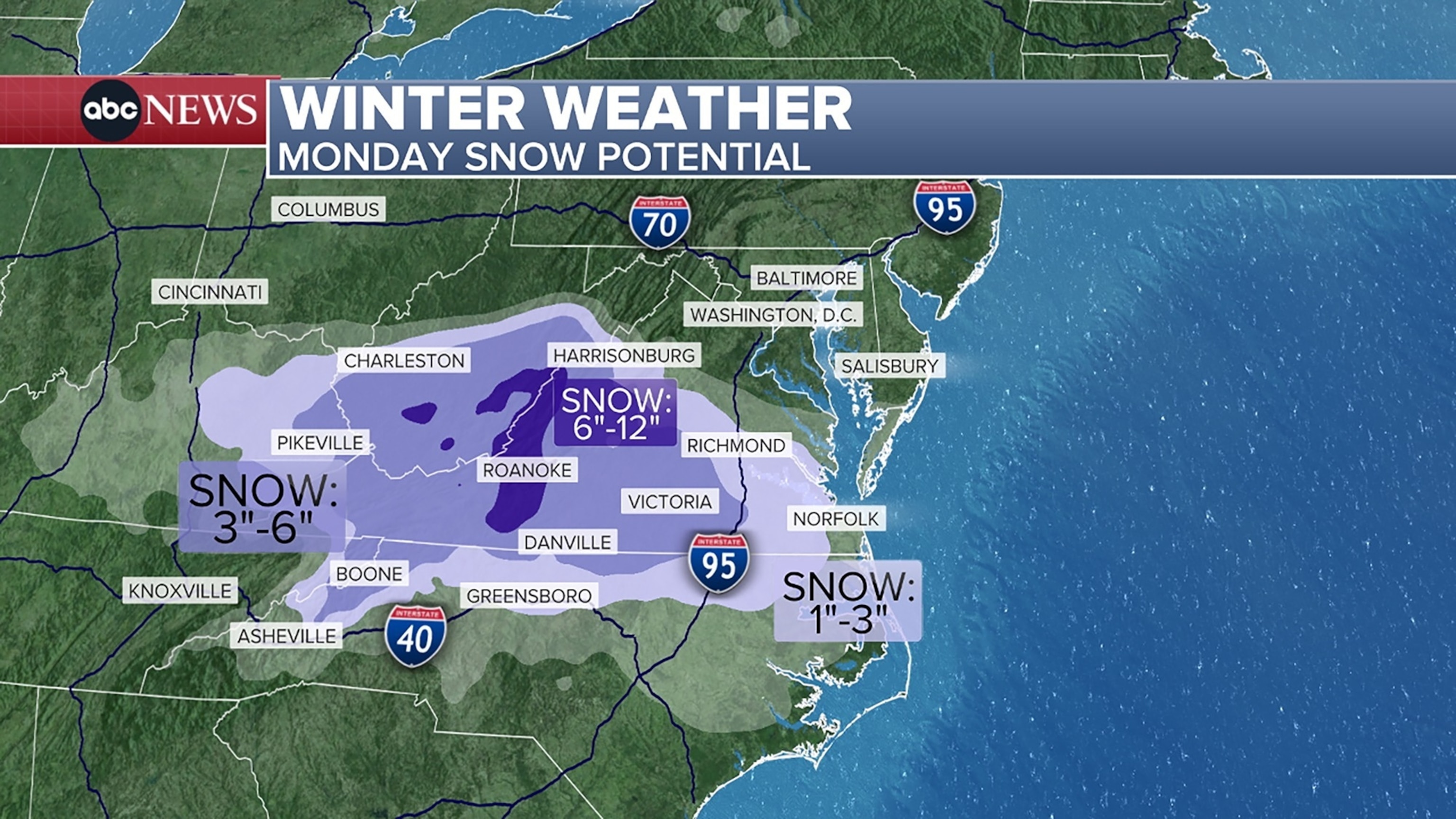 Después de un fin de semana de nieve en el Medio Oeste, el clima invernal se centrará más al sur el lunes, con nieve en Virginia, Virginia Occidental y Carolina del Norte. Mientras tanto, el noroeste del Pacífico se está preparando para un río atmosférico que provocará inundaciones peligrosas.