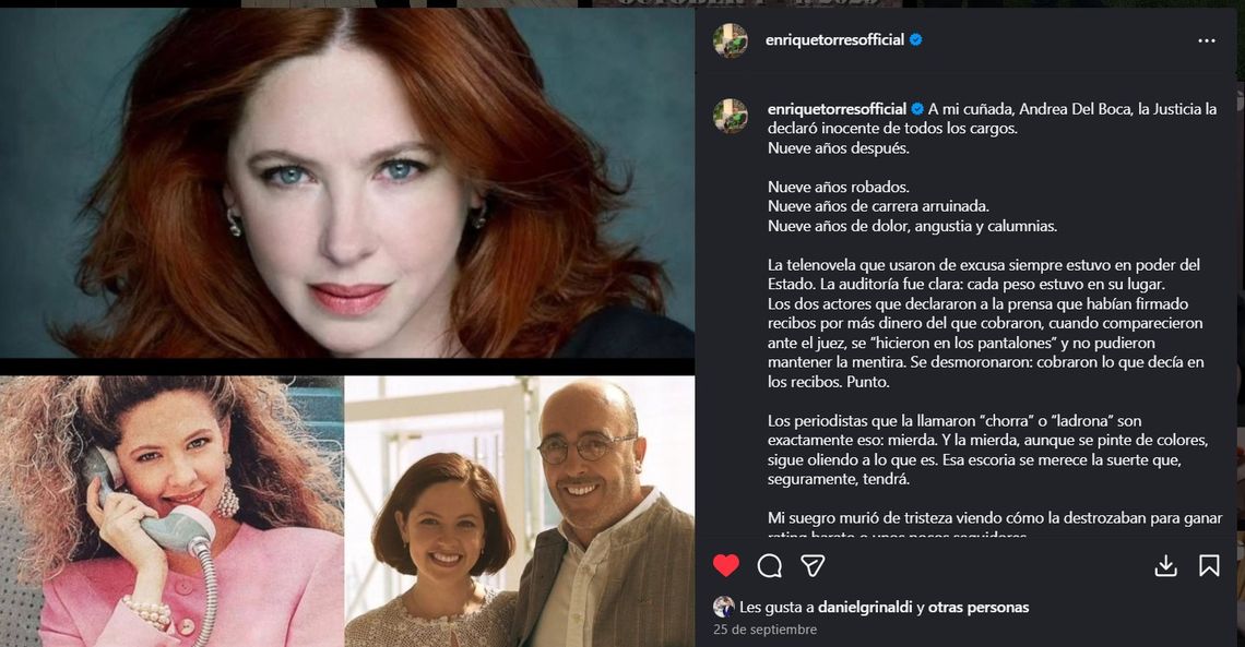 «A mi cuñada, Andrea Del Boca, la Justicia la declaró inocente de todos los cargos. Nueve años después. Nueve años robados. Nueve años de carrera arruinada. Nueve años de dolor, angustia y calumnias. La telenovela que usaron de excusa siempre estuvo en poder del Estado. La auditoría fue clara: cada peso estuvo en su lugar», comenzó Enrique, en un posteo que compartió en sus redes sociales, al referirse a la decisión de la justicia, que se conoció a fines de septiembre.