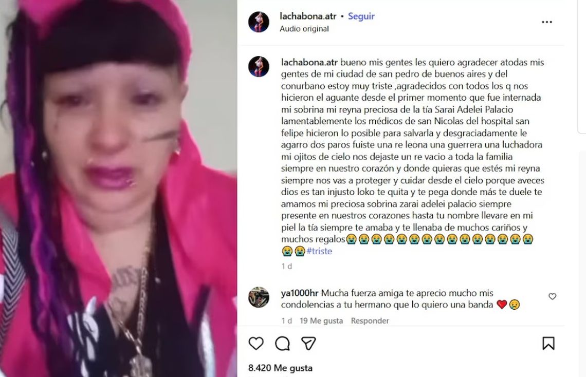 “Lamentablemente, Sarai falleció. Hola gente, acá les informo porque desde anoche estamos lamentablemente velando a mi sobrina, mi hermosa sobrina, era mi reina. Estamos destrozados, la verdad que nos dejó un vacío muy grande”, comenzó La Chabona, al compartir su inmenso dolor a través de las redes sociales.