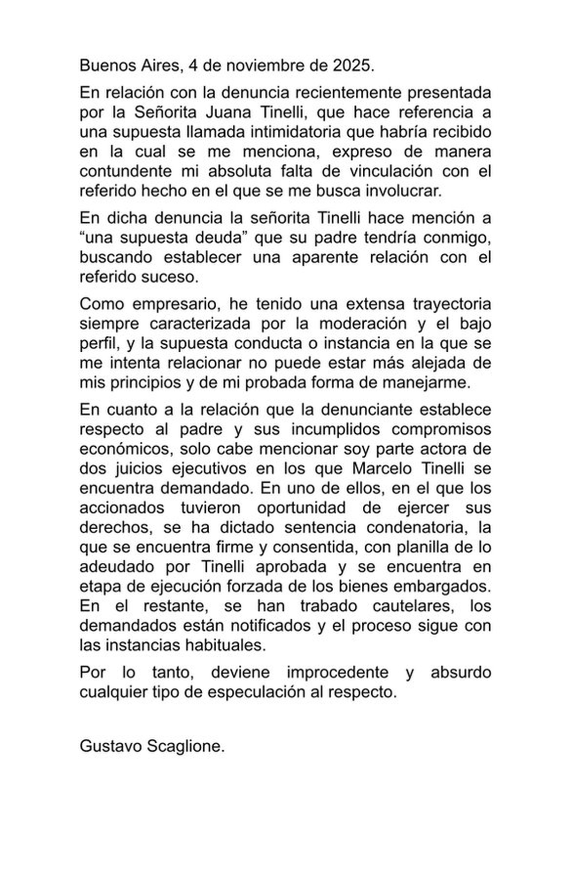 Después de que Juana Tinelli presentara una denuncia por amenazas y pidiera a la Justicia de la Ciudad de Buenos Aires un botón antipánico, Gustavo Scaglione emitió un comunicado en el que niega “una supuesta llamada intimidatoria” de su parte a la hija menor de Marcelo Tinelli.