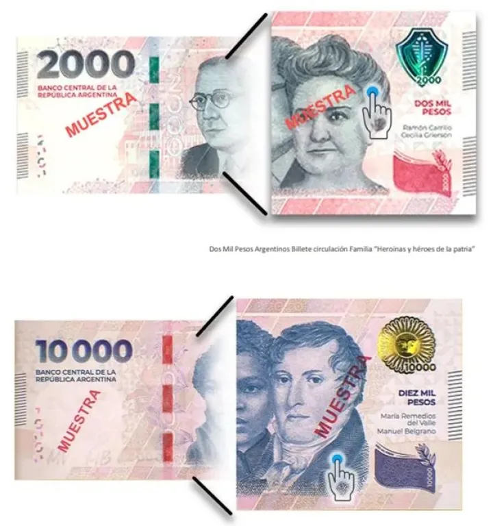- Pesos: Pase los dedos sobre el retrato, animal o símbolo principal para sentir el relieve de la impresión calcográfica. Verifique la marca de agua, hilo de seguridad y motivo complementario a contraluz. Incline el billete para observar la variabilidad óptica en números o símbolos.