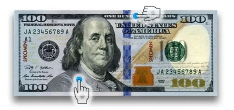 - Dólares: Sienta el relieve en retratos, números y letras. El papel debe ser firme y áspero. A contraluz, revise la marca de agua y el hilo de seguridad con la inscripción “USA”. Incline el billete para notar el cambio de color en los números y, en el de 100 dólares, observe la campana y el hilo 3D.