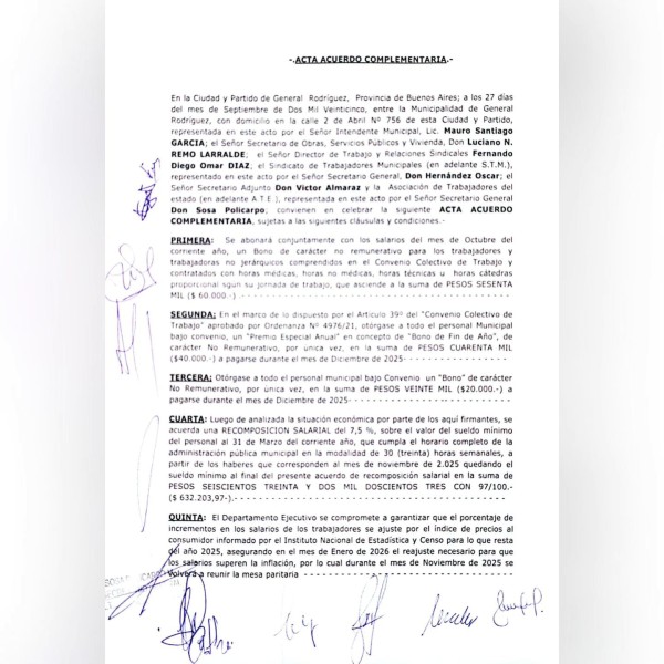 Desde STM Gral. Rodríguez destacaron en este sentido que «se acordó una cláusula de revisión para el mes de noviembre en caso de ser necesario de acuerdo a lo que informe el Indec». Asimismo, manifestaron: «Sabemos de la situación complicada que atraviesa nuestros país, pero aún así, los trabajadores y trabajadoras de Gral. Rodríguez no perderán poder adquisitivo como es costumbre desde hace ya varios años».