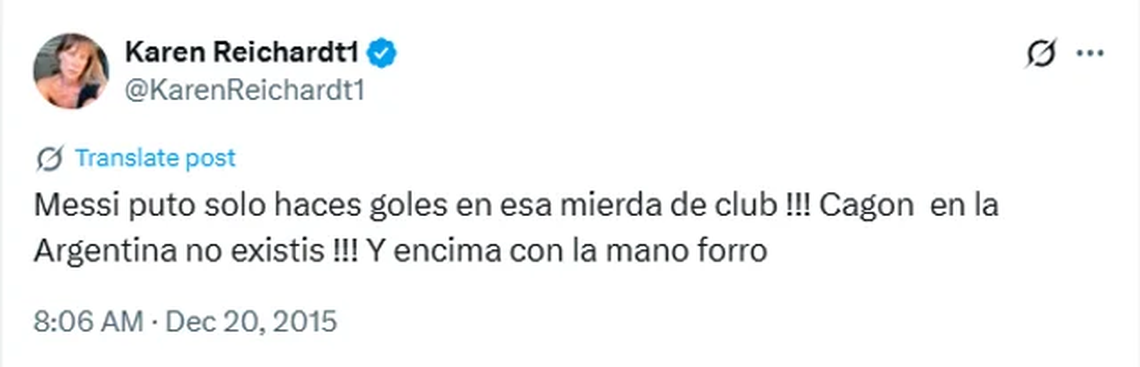 “Messi puto solo haces goles en esa mierda de club !!! Cagon en la Argentina no existis !!! Y encima con la mano forro”, fue la publicación de Reichardt en diciembre de 2015, cuando el crack rosarino convirtió en un encuentro con el Barcelona.