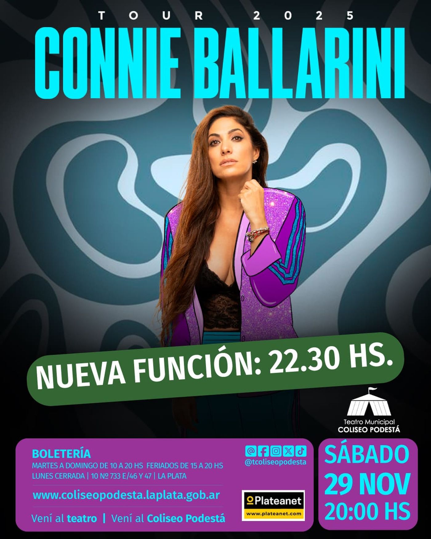 - Connie Ballarini– Sábado 29 a las 20 y 22.30