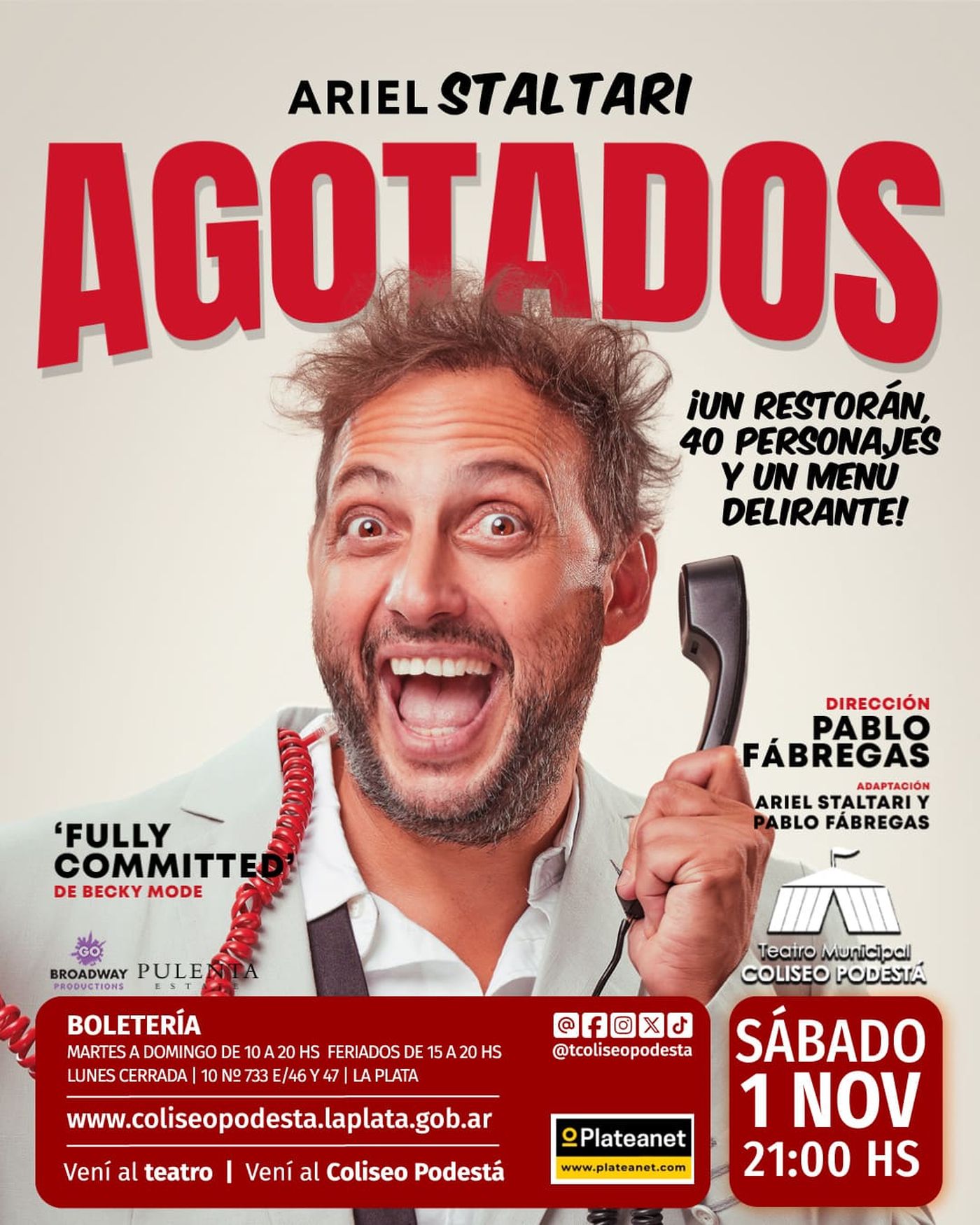 - Agotados, con Ariel Staltari – Sábado 1 a las 21