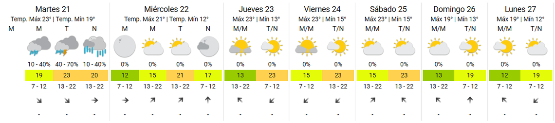 Ya para el miércoles, se esperan mejoras en el clima con un cielo parcialmente nublado y sin lluvias, con una mínima de 12°C y una máxima de 21°C. El índice de humedad relativa disminuirá, por lo que se prevé una jornada más fresca y seca.
