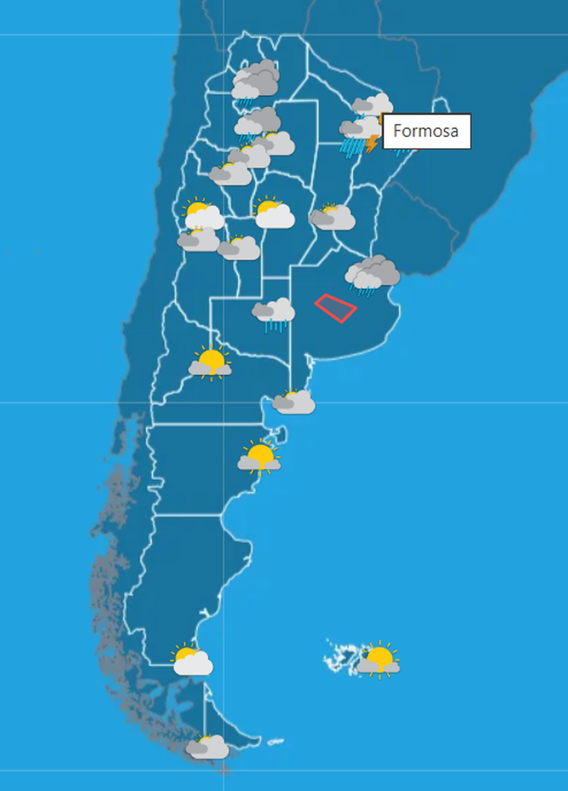 En la región centro del país, Córdoba, Santa Fe, Entre Ríos y parte de Buenos Aires, las temperaturas serán elevadas, pero algo más moderadas respecto del norte, con máximas entre 19°C y 22°C. Se prevé cielo parcialmente nublado, con lluvias intensas durante el día. Mientras que, en Mendoza, San Juan y La Rioja, se mantendrán condiciones con temperaturas en igualdad, con marcas entre 17°C y 19°C. Predominará el cielo despejado en la región sin rastros de lluvia.