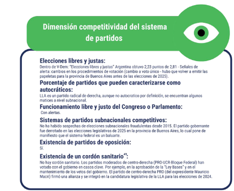 La única dimensión en verde funciona como un contrapeso dentro del diagnóstico general. El informe destaca que la Argentina mantiene elecciones libres y competitivas, con alternancia posible y un sistema político que sigue funcionando formalmente.