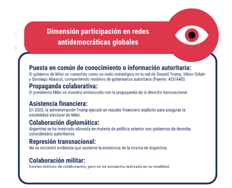 En términos diplomáticos, la Argentina reorientó su política exterior hacia un alineamiento casi exclusivo con Estados Unidos e Israel , rompiendo con tradiciones multilaterales y regionales. Este conjunto de movimientos configura, según el informe, una inserción internacional que no solo redefine la política exterior, sino que también retroalimenta dinámicas internas de erosión democrática.