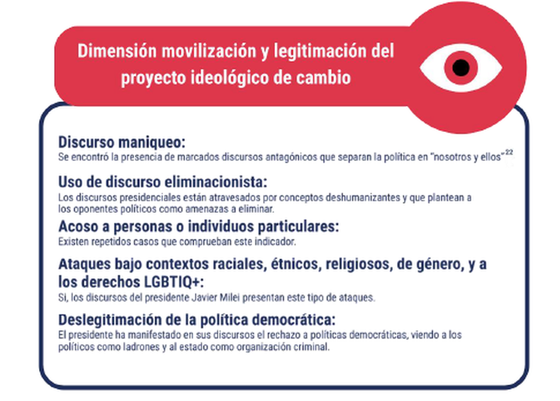 La dimensión discursiva aparece como uno de los rasgos más consistentes del gobierno. El informe sostiene que la narrativa oficial no se moderó tras la llegada al poder, sino que, por el contrario, se profundizó.