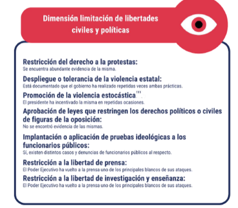 Estas dimensiones son: contexto político, social y cultural nacional; movilización y legitimación del proyecto ideológico de cambio; participación en redes antidemocráticas globales; competitividad del sistema de partidos; reformas para concentrar el poder; y limitaciones a las libertades civiles y políticas.