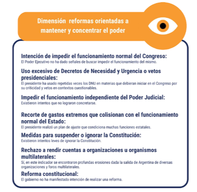 El segundo indicador en amarillo se centra en la dinámica institucional y el equilibrio de poderes. El informe advierte sobre el uso intensivo de herramientas excepcionales, como los Decretos de Necesidad y Urgencia (DNU) y los vetos presidenciales. Estas herramientas, si bien previstas por la Constitución, adquieren otra dimensión cuando se convierten en mecanismos habituales de gobierno.