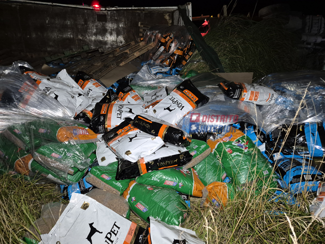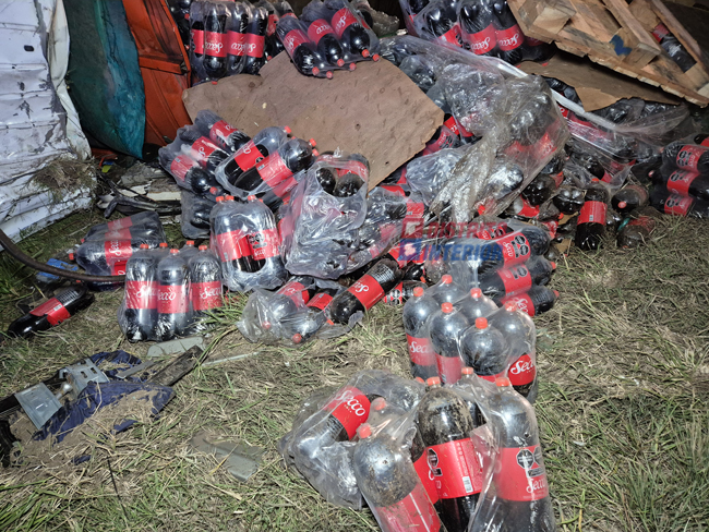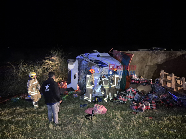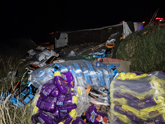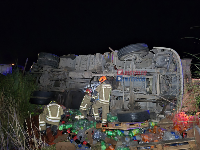 ESTA MADRUGADA: volcó un camión en la R33, viajaba cargado con gaseosas y alimento para mascotas