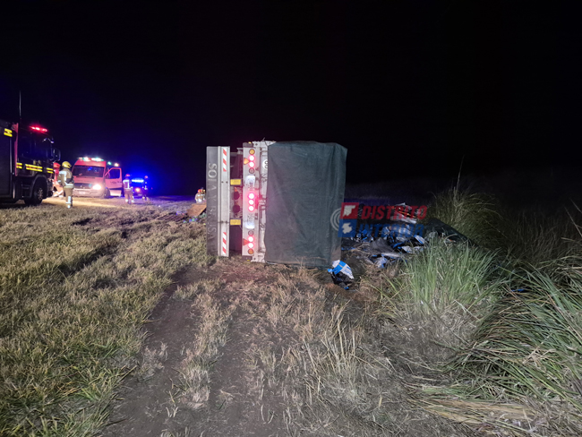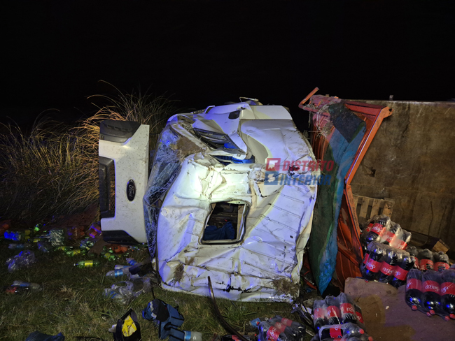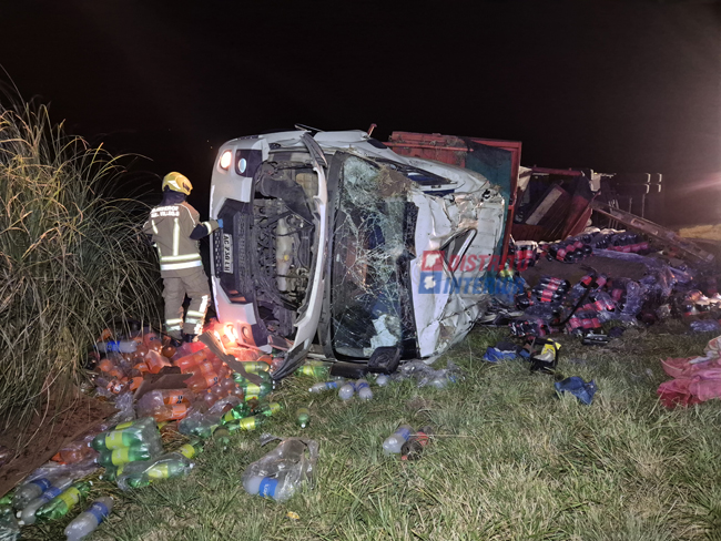 Al intentar volver al asfalto se produjo el vuelco que dejó la cabina totalmente dañada y chasis y acoplado volcados sobre uno de los laterales, el chasis quedó «mirando» hacia la ruta y el acoplado hacia el alambrado, en ambos casos con la carga desparramada por completo. El chasis transportaba gaseosas y el acoplado alimento para mascotas.