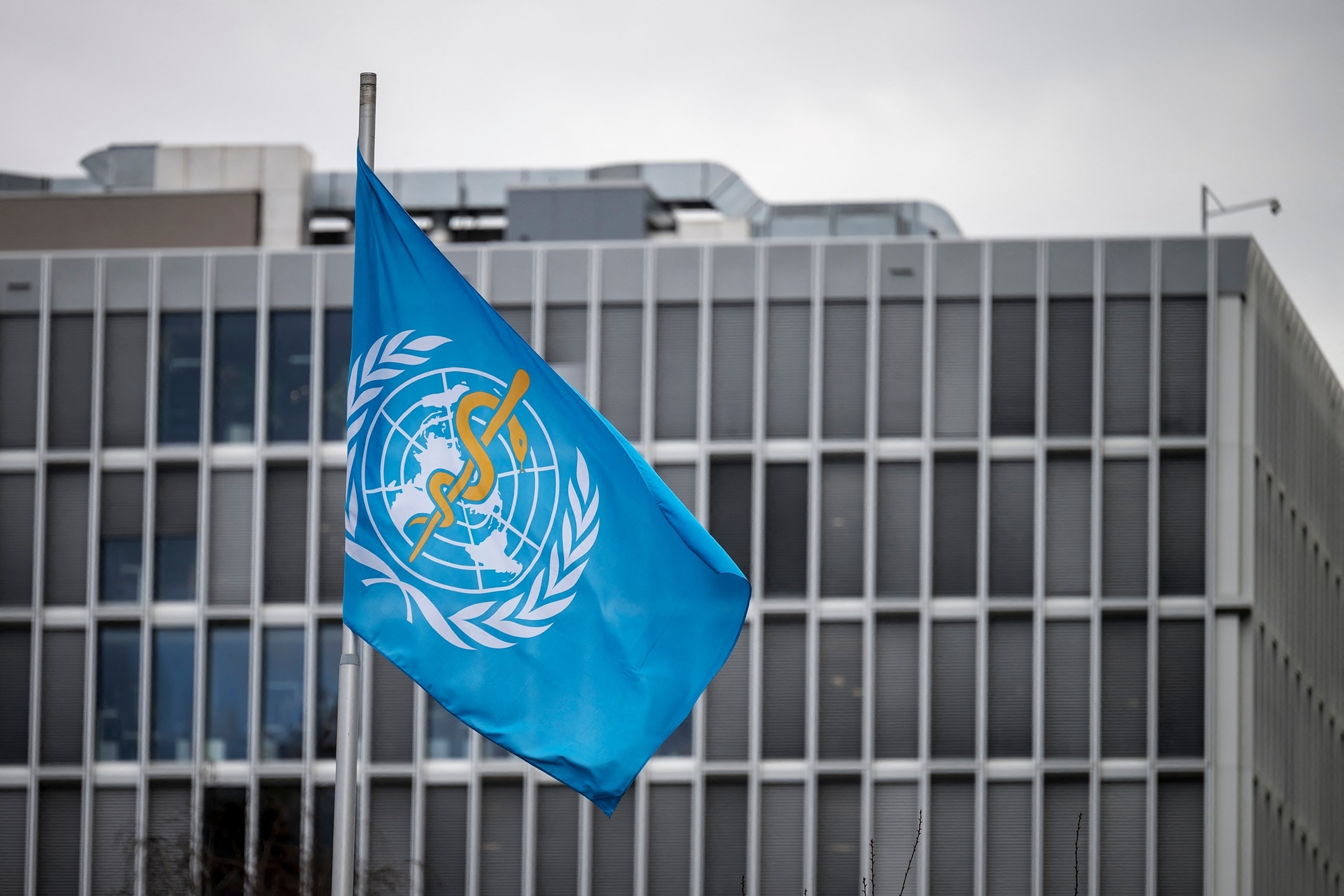 Una bandera de la Organización Mundial de la Salud (OMS) ondea al viento en su sede en Ginebra, el 13 de marzo de 2025.