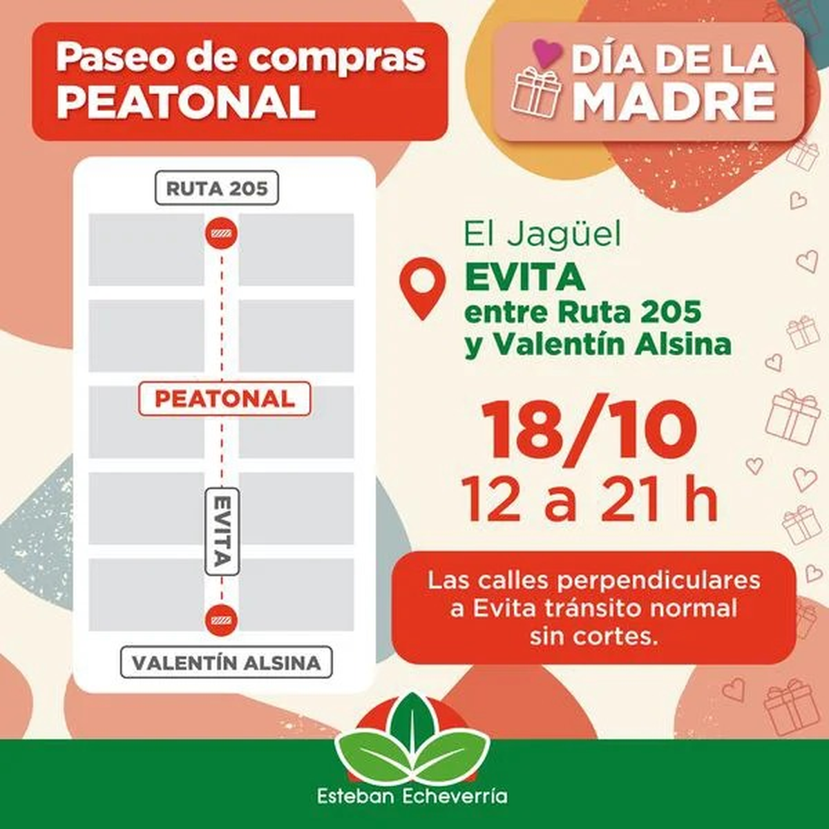 El Municipio de Esteban Echeverría anunció que este sábado 18 de octubre se realizará un paseo de compras peatonal en el centro comercial de El Jagüel, con motivo de la celebración del Día de la Madre.