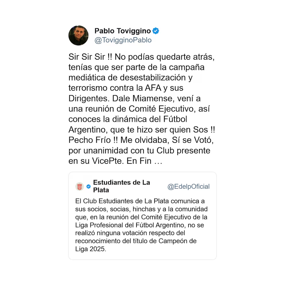Un par de minutos después, Pablo Toviggino, Tesorero de la AFA, le contestó a la institución platense en su cuenta oficial de X: “Sir Sir Sir!! No podías quedarte atrás, tenías que ser parte de la campaña mediática de desestabilización y terrorismo contra la AFA y sus Dirigentes. Dale Miamense, vení a una reunión de Comité Ejecutivo, así conoces la dinámica del Fútbol Argentino, que te hizo ser quien Sos!! Pecho Frío!! Me olvidaba, Sí se Votó, por unanimidad con tu Club presente en su VicePte. En Fin…”. Vale recordar que este domingo, desde las 17.30, Rosario Central recibe a Estudiantes en el Gigante de Arroyito por los octavos de final del Torneo Clausura.