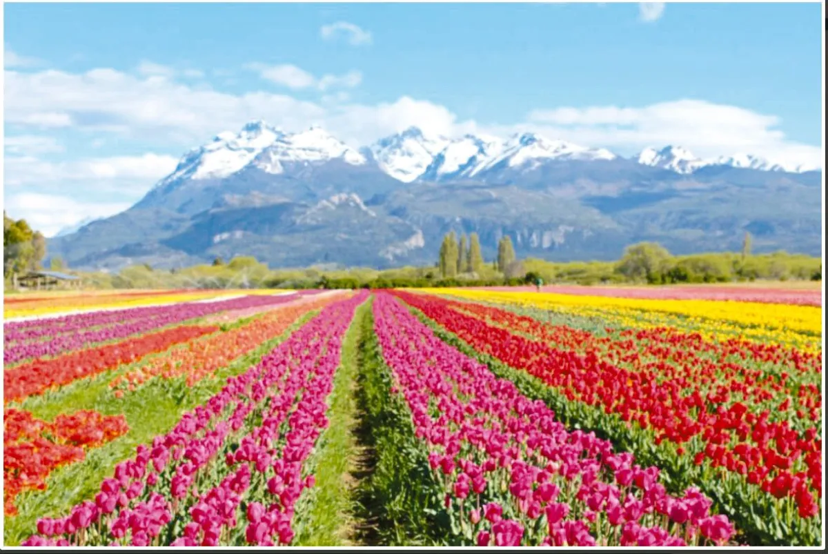Después del traqueteo del tren y la calma nocturna de la estepa, la Patagonia vuelve a sorprender con otra postal imposible. Cada primavera, cuando el frío comienza a retroceder y las montañas aún conservan sus picos nevados, el Campo de Tulipanes de Trevelin estalla en color. Más de un millón de tulipanes florecen al pie de la cordillera, desplegando una paleta que parece pintada a mano: rojos encendidos, violetas profundos, amarillos que reflejan el sol del mediodía.