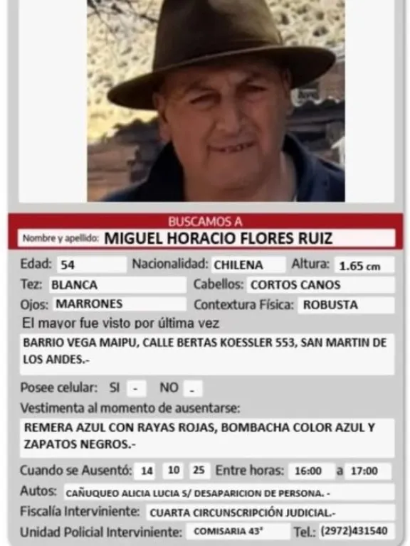 Un vecino intensamente buscado en San Martín de los Andes fue hallado sin vida este miércoles, pasadas las 13:30, en cercanías de un arroyo entre el barrio Vega Maipú y la subida Los Pinos, que conecta con el barrio Chacra 30.
