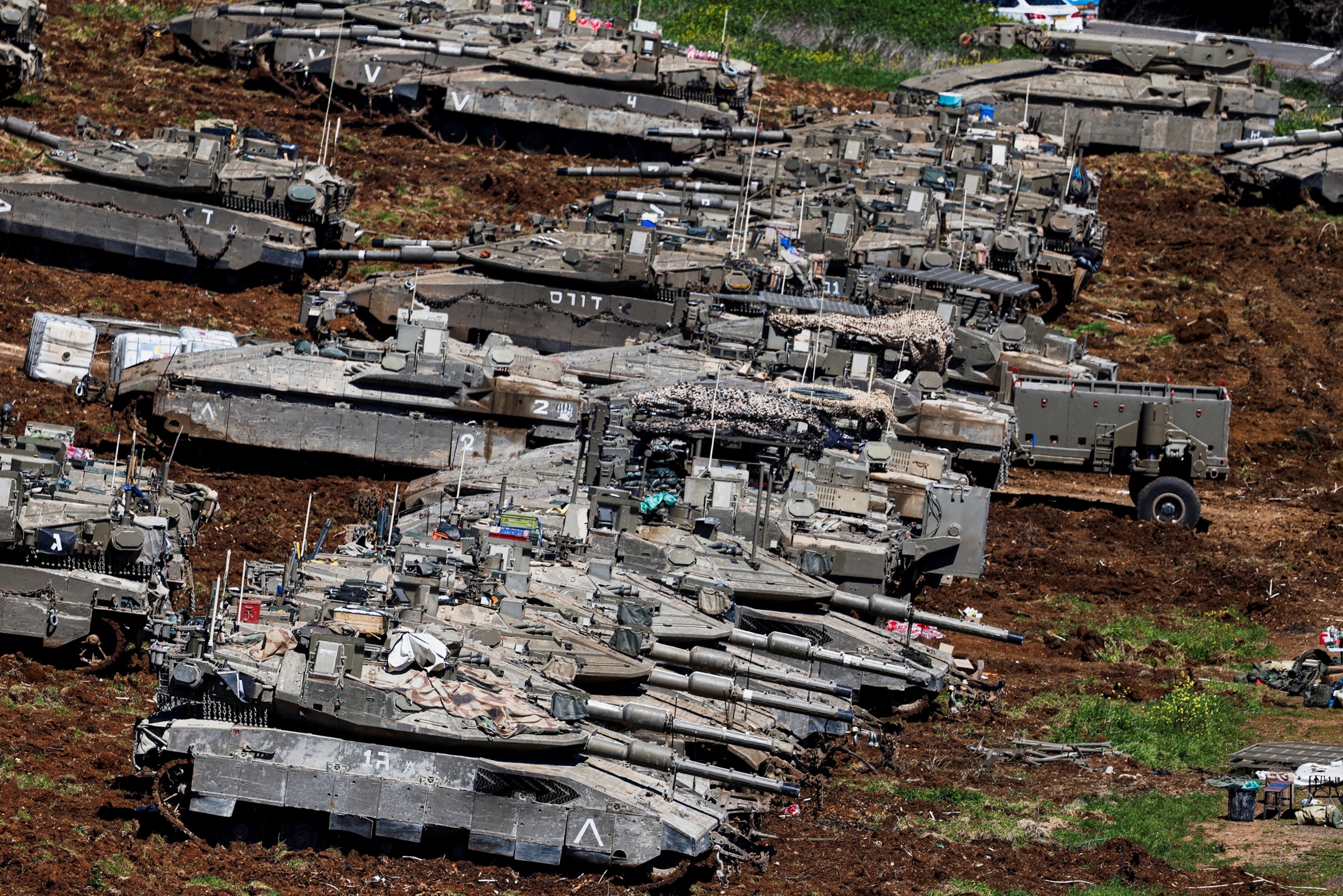 Israeli tanks on the Israeli side of the Israel-Lebanon border, following an escalation between Hezbollah and Israel amid the U.S.-Israeli conflict with Iran, in northern Israel, March 8, 2026.